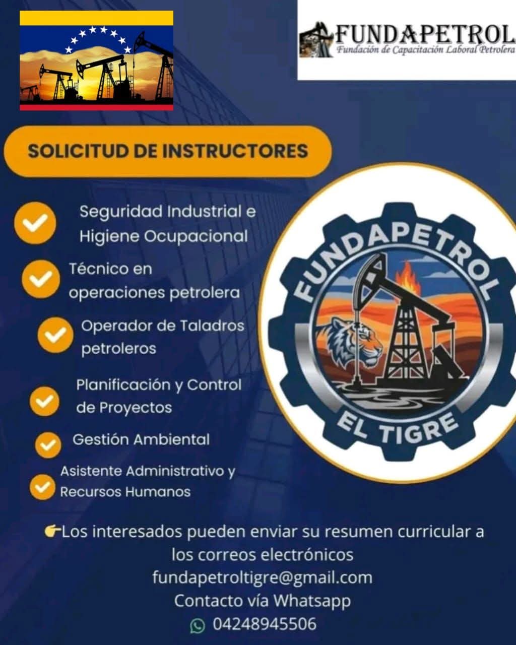 FUNDAPETROL ha iniciado El proceso de captación de profesionales para sumarse a su equipo de Instructores Profesionales en las ciudades de El Tigre, Pariaguán, Cantaura, Barcelona y Ciudad Bolívar.